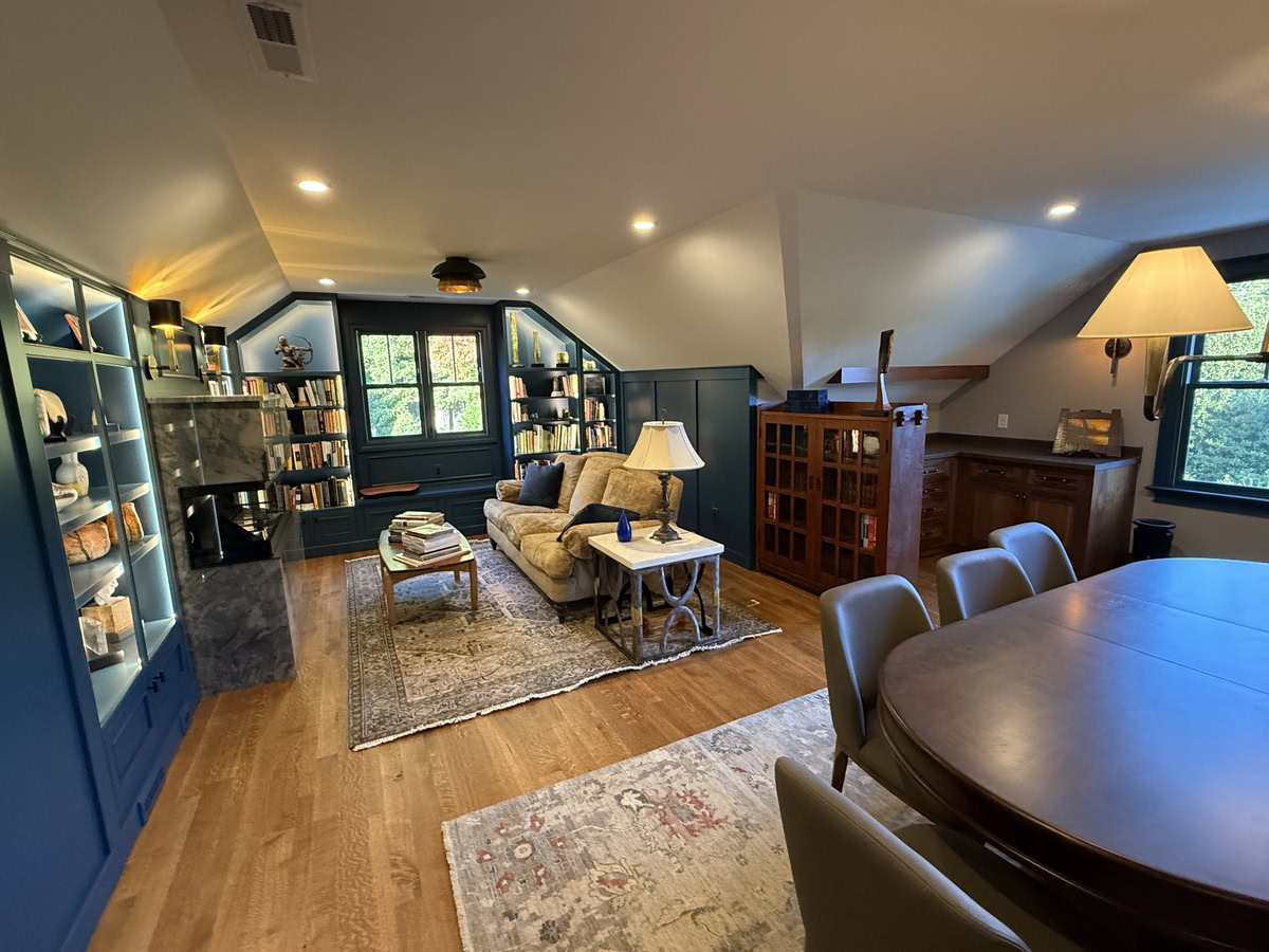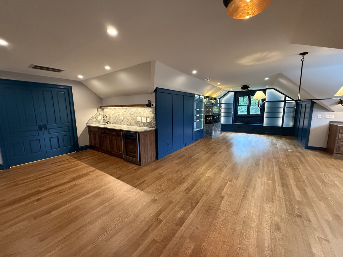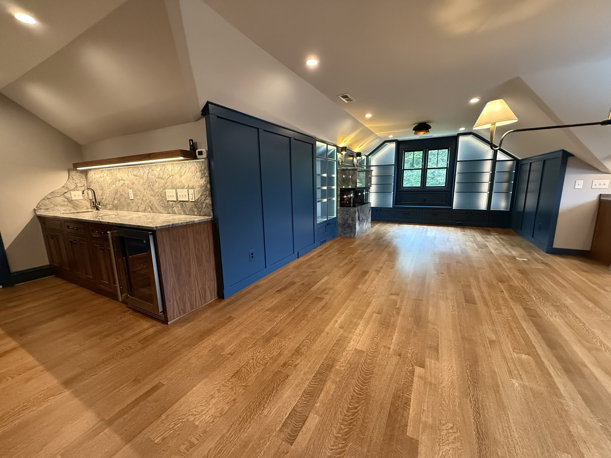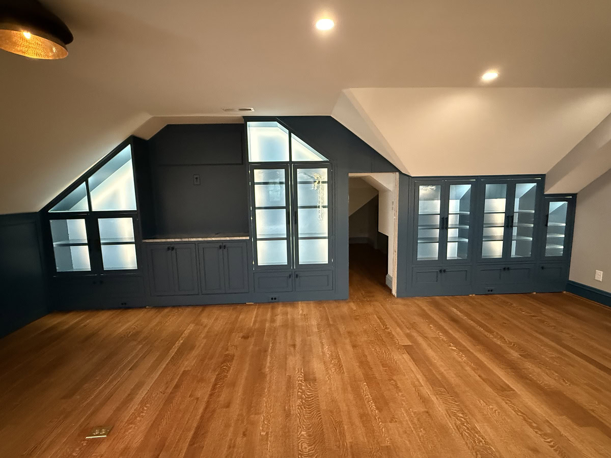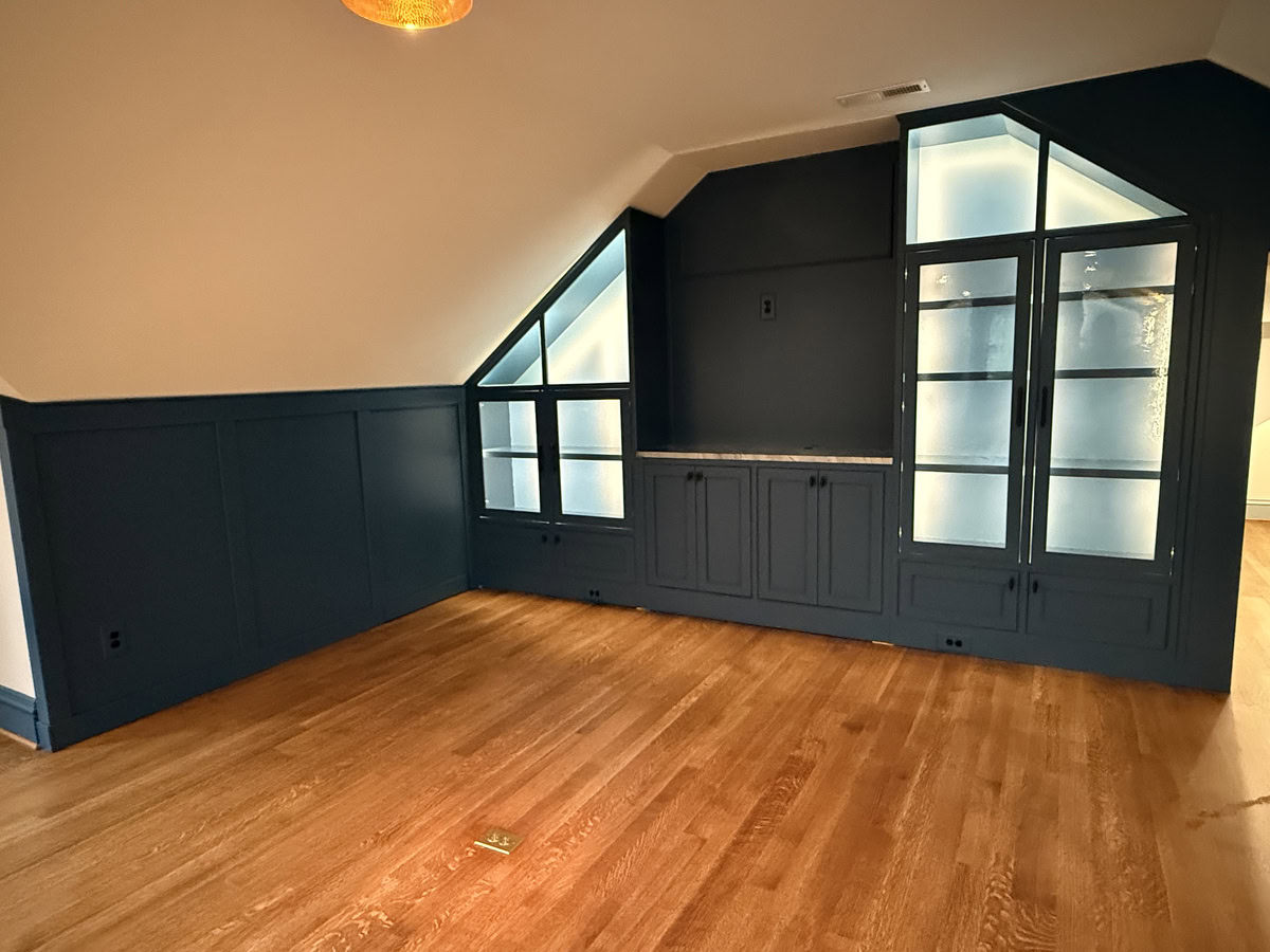 This museum-quality custom library in Durham showcases Prince & Sons' expertise in high-end residential renovations. The project features extensive custom cabinetry with integrated LED lighting throughout, designed to display a unique art collection. Distinctive elements include three concealed hidden doors that maintain the room's seamless aesthetic, custom wainscoting panels, and quartzite countertops. This custom renovation required precise coordination between our cabinet installers, finish carpenters, and licensed electricians to achieve gallery quality results. Every detail was designed to museum standards, from the varying plank widths in the flooring to the professionally wired lighting system that illuminates the homeowner's collection of fine art and decorative glass pieces.