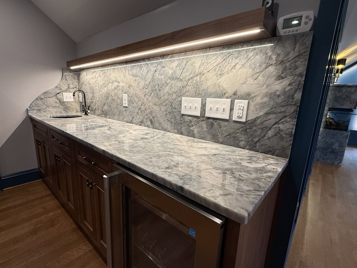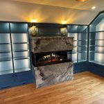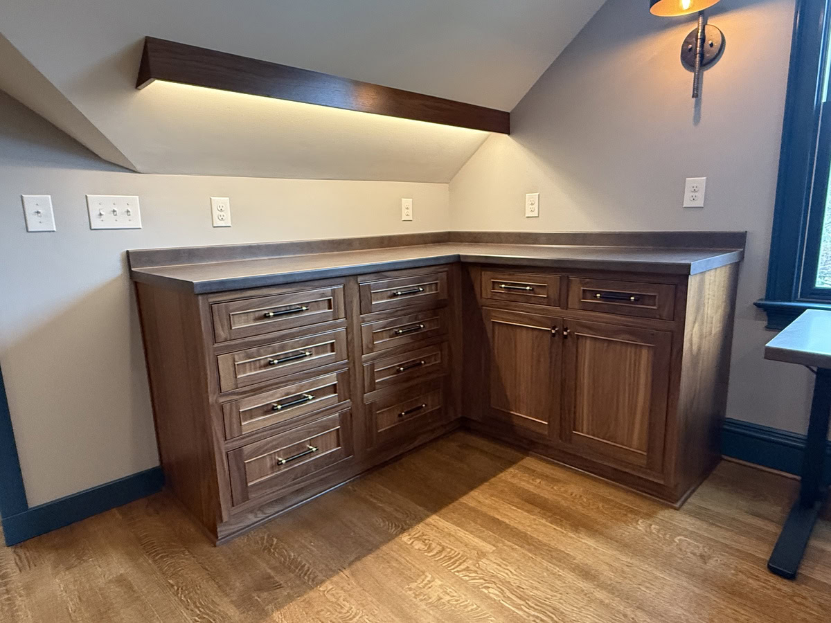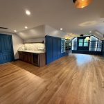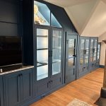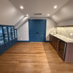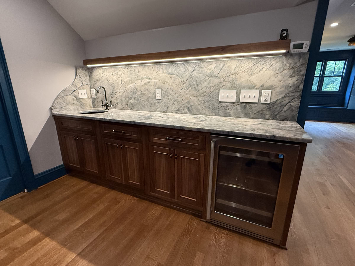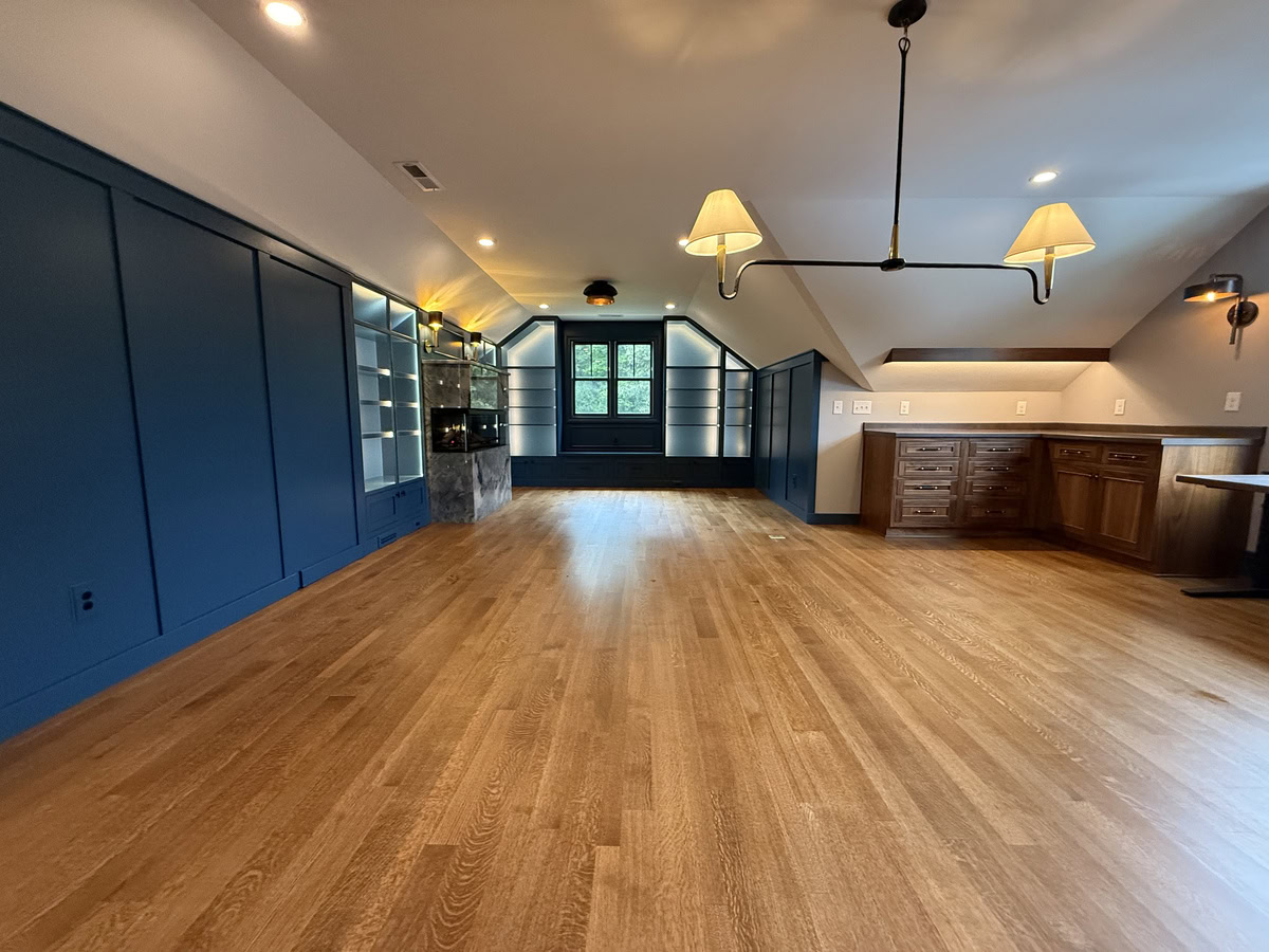 This museum-quality custom library in Durham showcases Prince & Sons' expertise in high-end residential renovations. The project features extensive custom cabinetry with integrated LED lighting throughout, designed to display a unique art collection. Distinctive elements include three concealed hidden doors that maintain the room's seamless aesthetic, custom wainscoting panels, and quartzite countertops. This custom renovation required precise coordination between our cabinet installers, finish carpenters, and licensed electricians to achieve gallery quality results. Every detail was designed to museum standards, from the varying plank widths in the flooring to the professionally wired lighting system that illuminates the homeowner's collection of fine art and decorative glass pieces.