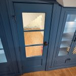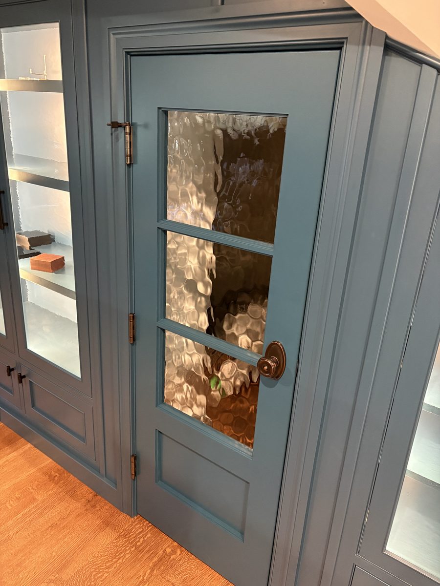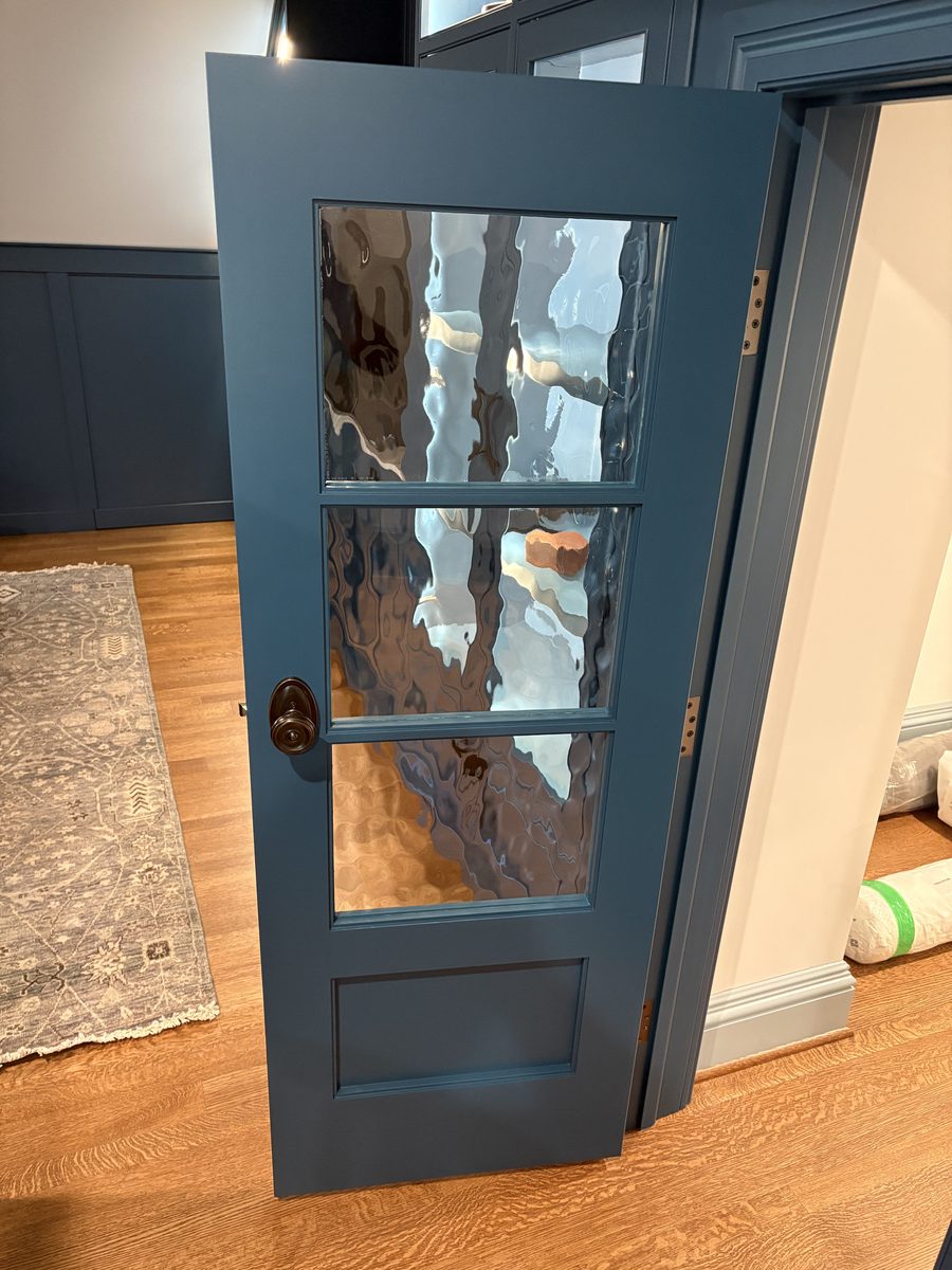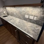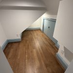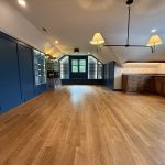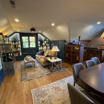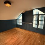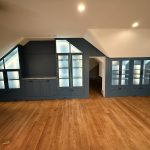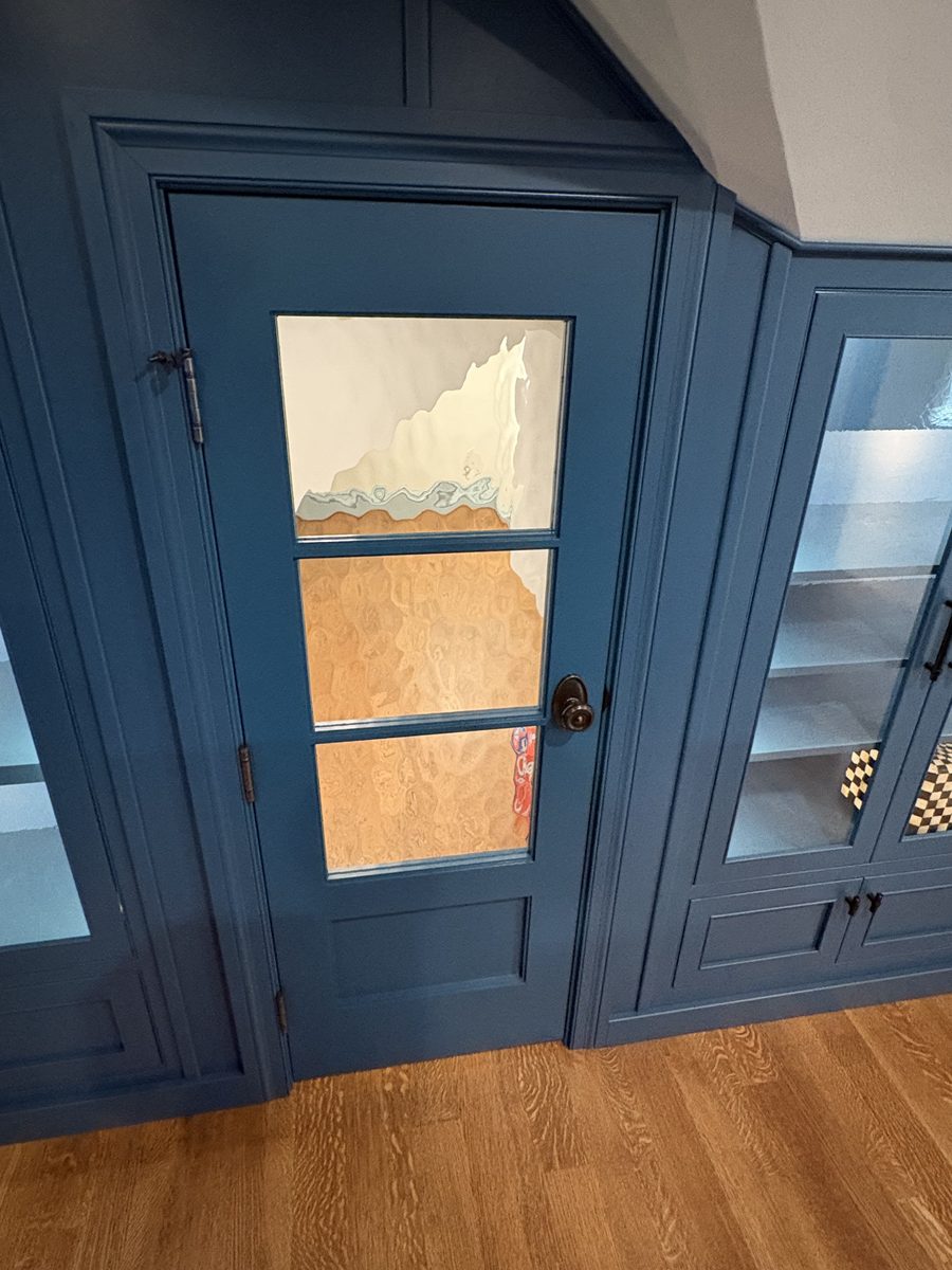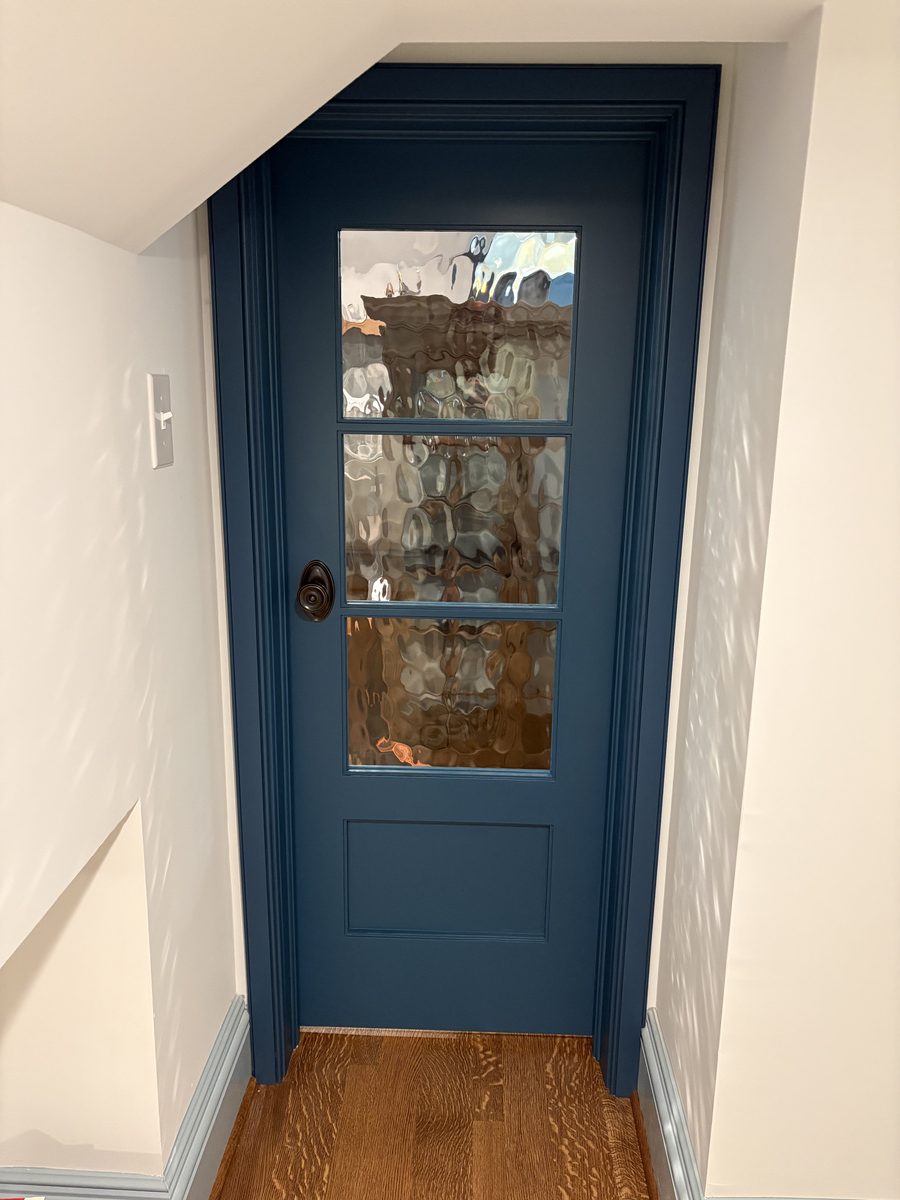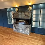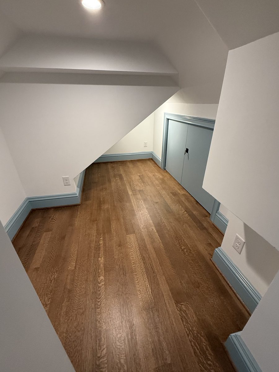 This museum-quality custom library in Durham showcases Prince & Sons' expertise in high-end residential renovations. The project features extensive custom cabinetry with integrated LED lighting throughout, designed to display a unique art collection. Distinctive elements include three concealed hidden doors that maintain the room's seamless aesthetic, custom wainscoting panels, and quartzite countertops. This custom renovation required precise coordination between our cabinet installers, finish carpenters, and licensed electricians to achieve gallery quality results. Every detail was designed to museum standards, from the varying plank widths in the flooring to the professionally wired lighting system that illuminates the homeowner's collection of fine art and decorative glass pieces.